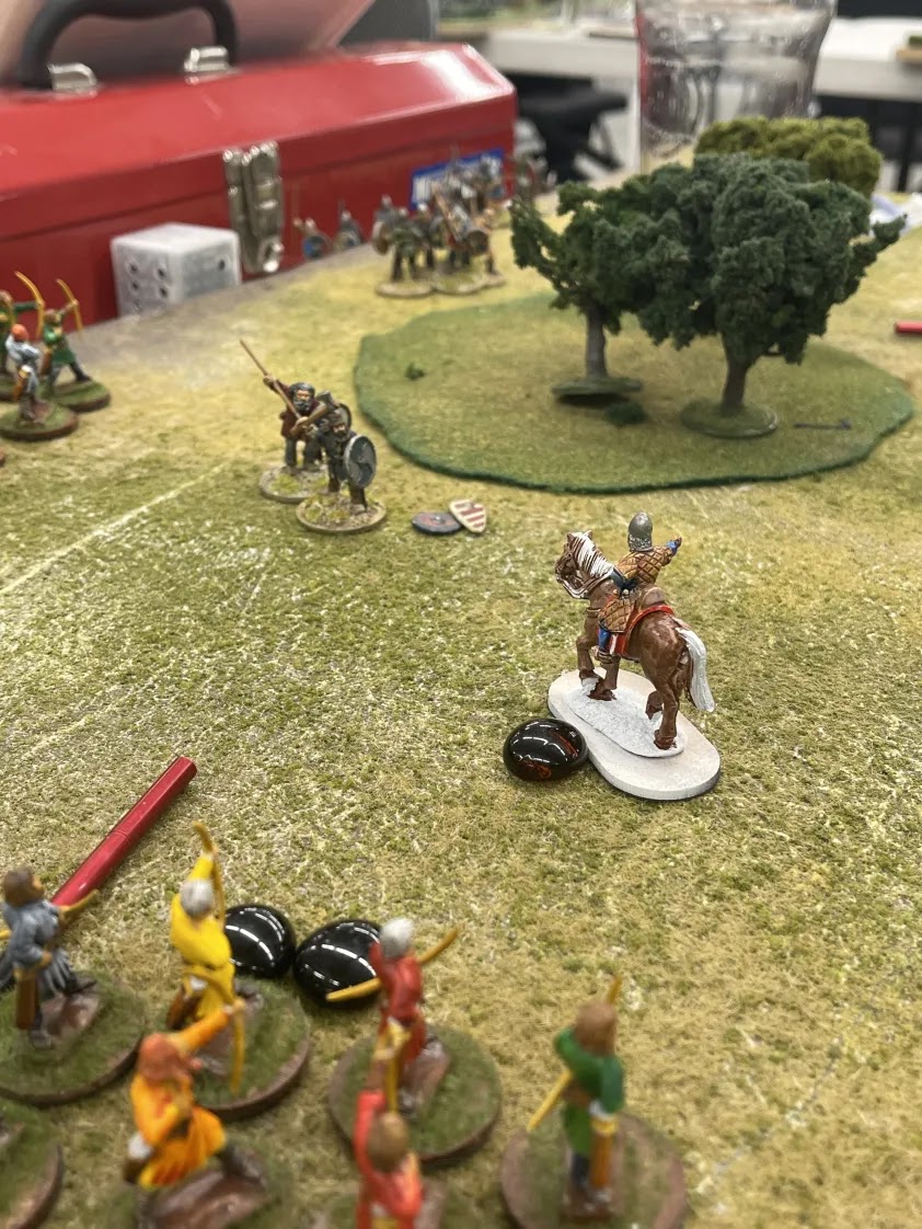 Unfortunately, it seems the action was so intense that very few photos were taken, including from my own game against Benoit's Welsh. Here are couple of photos from our game, I used the same composition as I had used couple of nights before in my game against Graham's Anglo-Saxons. Our game was toughly fought out and I believe Benoit edged me by 1 point, so a draw in SAGA terms.